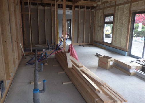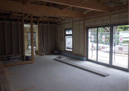 外装工事がほぼ完了し、内装工事施工中です。内装工事の一部はお施主様から別業者への発注になるため、施工区分について綿密に打合せしながら施工しております。